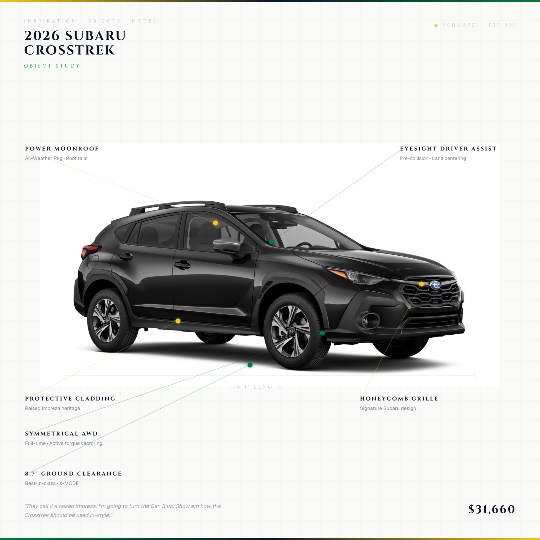 DesignMar 2026P2C-0032026 Subaru CrosstrekThree generations deep and the Crosstrek continues to set the bar. It started as a raised Impreza: longer struts, wider track, actual geometry changes. Not a spacer lift. Gen 3 follows the Crosstrek’s lead. 8.7 inches of clearance, Symmetrical AWD, X-MODE dual-function. I need that daily utility without trade-off. The Crystal Black Silica shows the cladding lines exactly how they should be seen. I wanna go Outback ’26 but the budget came first. Plus this is a car....raised up? Movie in 8k.+